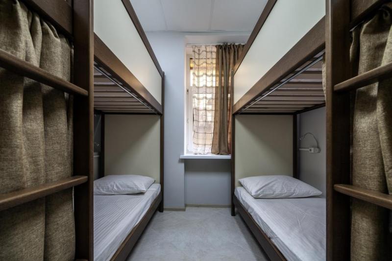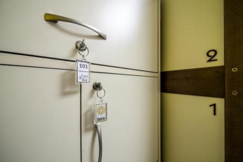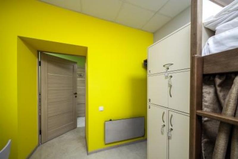 A cosy bedroom with two double bunk beds. Each guest has individual sockets and a lamp near the bed. Additionally, you will find individual spacious locker with a socket inside. The room has a chair, a table, and a coat rack.