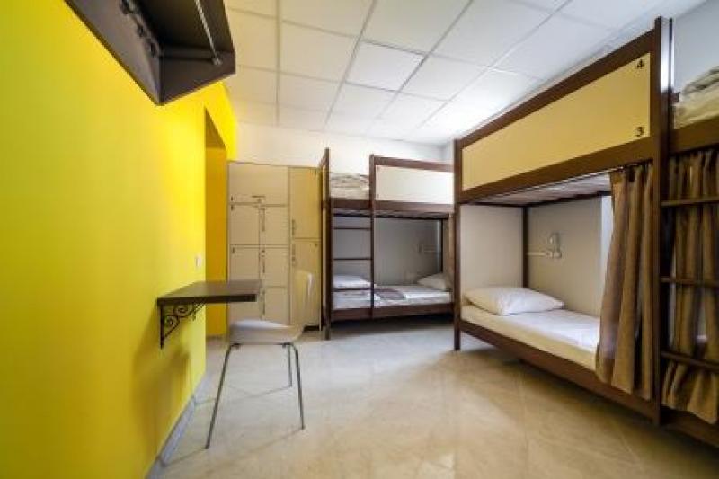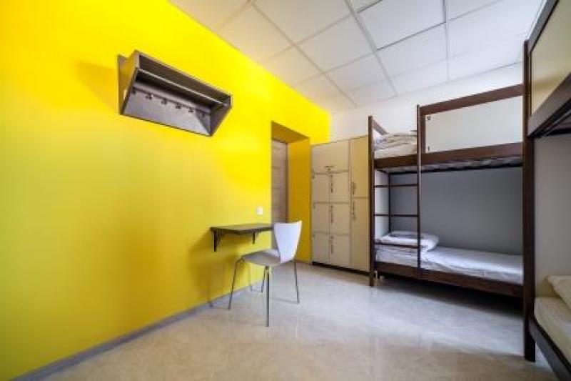 Світла шестимісна кімната з двоярусними ліжками, обладнаними розетками та світильниками біля кожного ліжка. Також є індивідуальні шафи для кожного гостя з розетками всередині, стіл, стілець, вішалка для одягу. В кімнаті стоїть розкладне крісло, яке при потребі можна використати як додаткове ліжко.